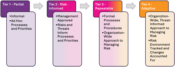 Each tier reflects how rigorously an organization integrates cybersecurity into decision-making, governance, and operations. Tiers are commonly applied to Organizational Profiles to help define both current and target states.