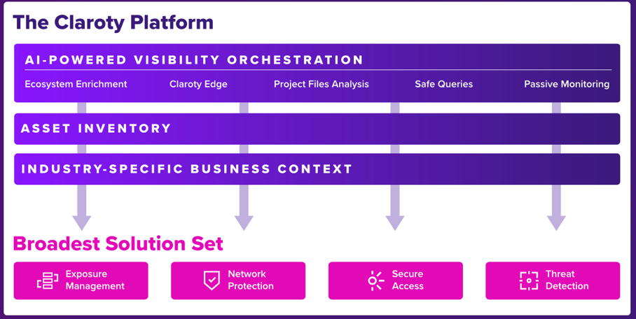 - Claroty highlights the breadth of different products offered by their Platform, ranging from secure remote access to exposure management and threat detection.